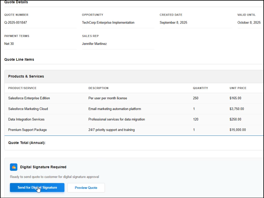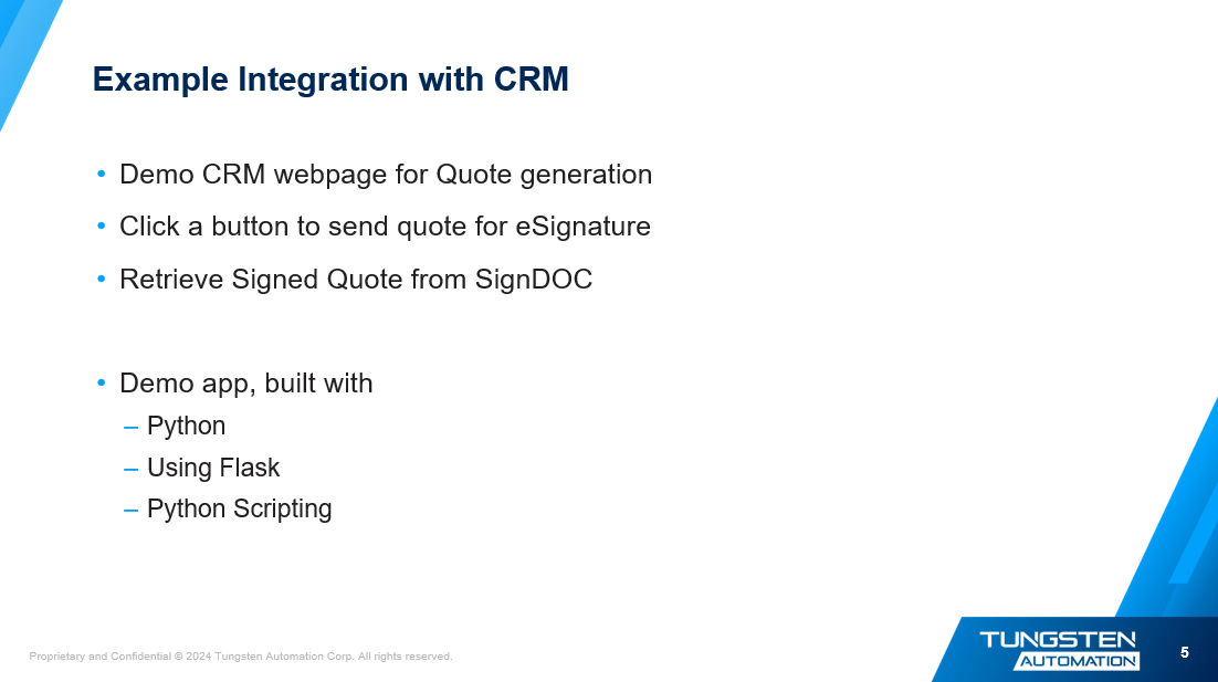 This project demonstrates the use of the Tungsten SignDoc API and its capability to integrate with customer applications (such as BPM or CRM systems) to obtain digital signatures as the final step in any process. This demo utilizes a dummy CRM page to display a quote, which can then be sent to the customer for a digital signature.