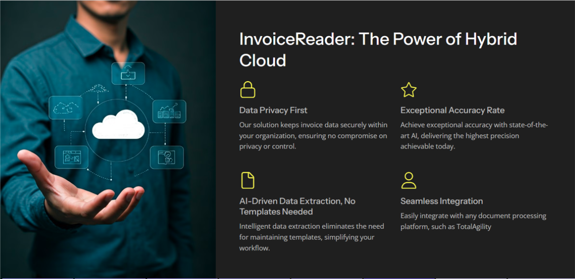 Achieving high accuracy in invoice data extraction without relying on numerous templates often requires advanced Intelligent Document Processing (IDP). With InvoiceReader, a connector built specifically for TotalAgility, organizations can achieve exceptional accuracy while addressing privacy concerns. This hybrid solution keeps sensitive data on-premises, using KTA for seamless document workflow integration while leveraging secure cloud services for metadata processing and AI-driven insights.