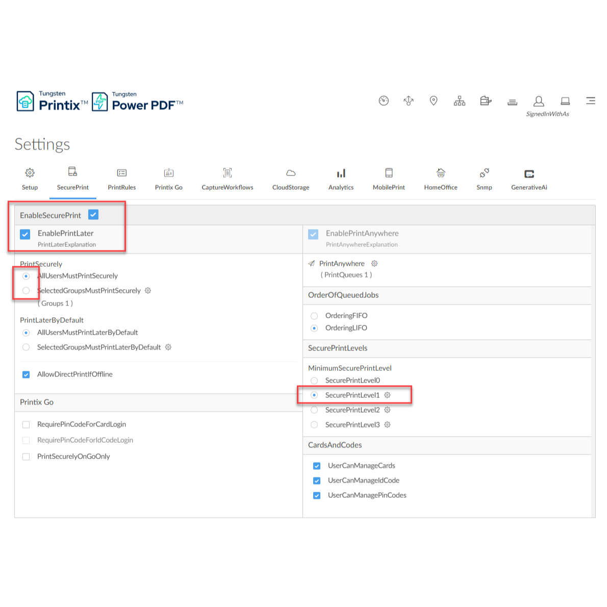 - Enable Secure Features: Activate the "secure printing" functionality, specifically enabling the "print later" option using QR codes for the selected printer or printers.