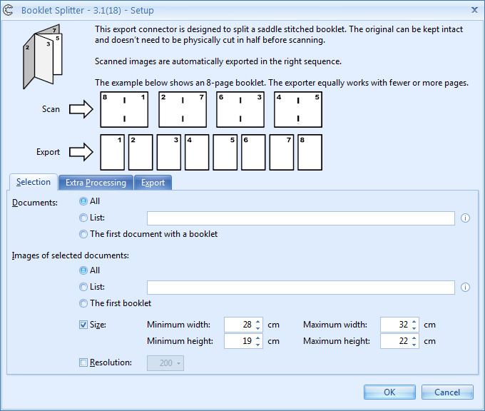The CaptureBites™ Booklet Splitter can split booklets from 4 pages to as many pages as required. The splitting and re-ordering is calculated completely automatically.