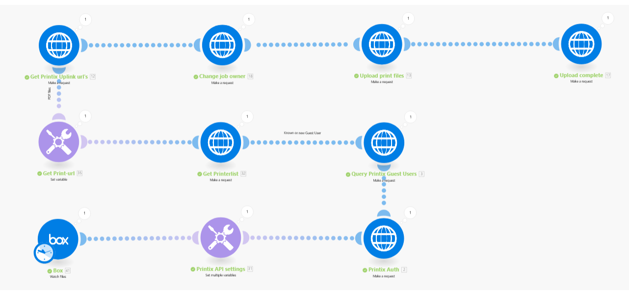 This connector uses the Make.com iPaaS platform to automatically send each new document to the Printix Anywhere print queue whenever it's added to a Box.com folder.
