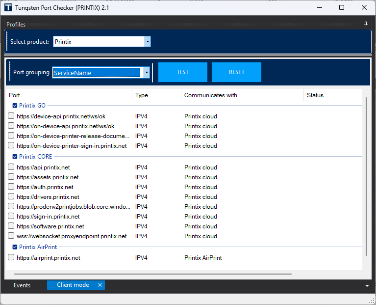 Similarly, when installing the Printix Client or Embedded Go applications, the Port Checker can be used to validate access to the Printix Cloud services. This utility enables you to quickly detect any network port or URL-related issues.