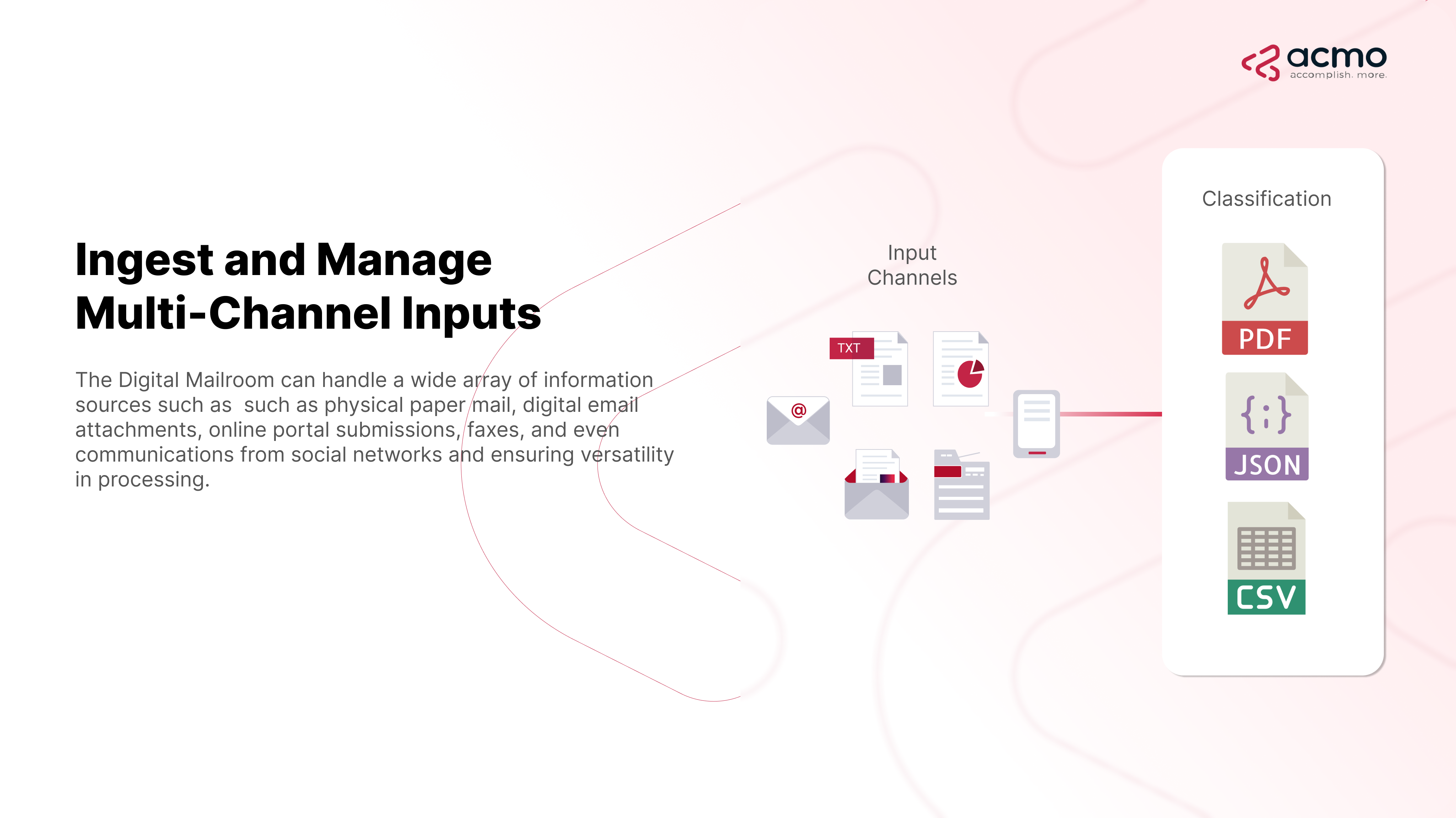 Multi-Channel Inputs: The Digital Mailroom can handle a wide array of information sources, ensuring versatility in processing. It seamlessly manages diverse content such as physical paper mail, digital email attachments, online portal submissions, faxes, and even communications from social networks. Made for Workflows: Incoming information undergoes automatic processing, seamlessly integrating with your established workflows. This eliminates the need for manual intervention, ensuring that critical data and documents smoothly flow through your business operations, enhancing overall efficiency and productivity.