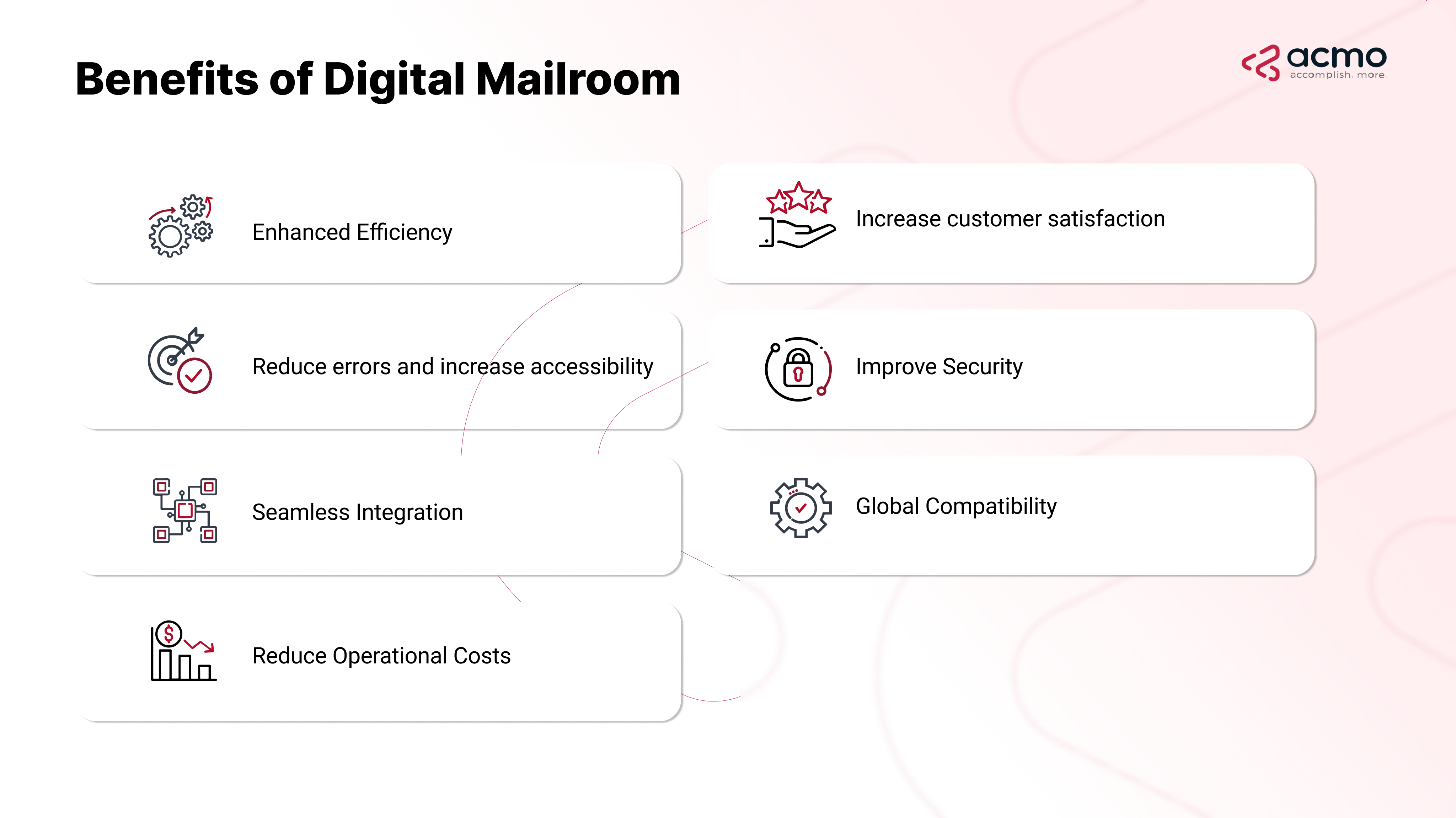 Reduce Operational Costs: By eliminating the need for physical document storage, expensive couriers, and real estate costs, the Digital Mailroom leads to significant reductions in operational expenses. Additionally, the move towards a paperless environment supports environmental sustainability efforts.