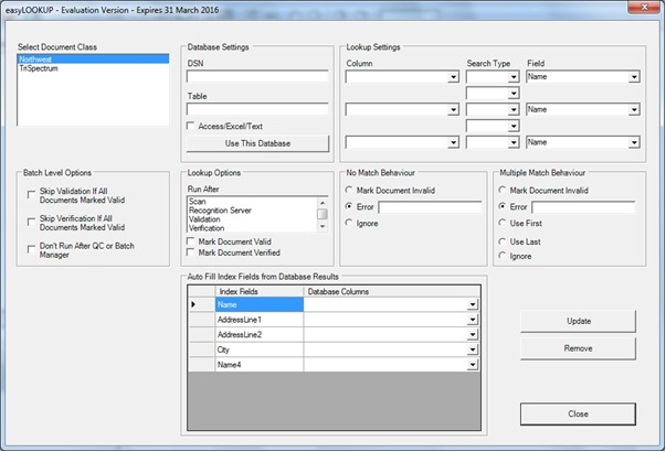 easyLOOKUP allows you to configure complex multi-field database lookups against index field values, and automatically populate other index fields with the results.