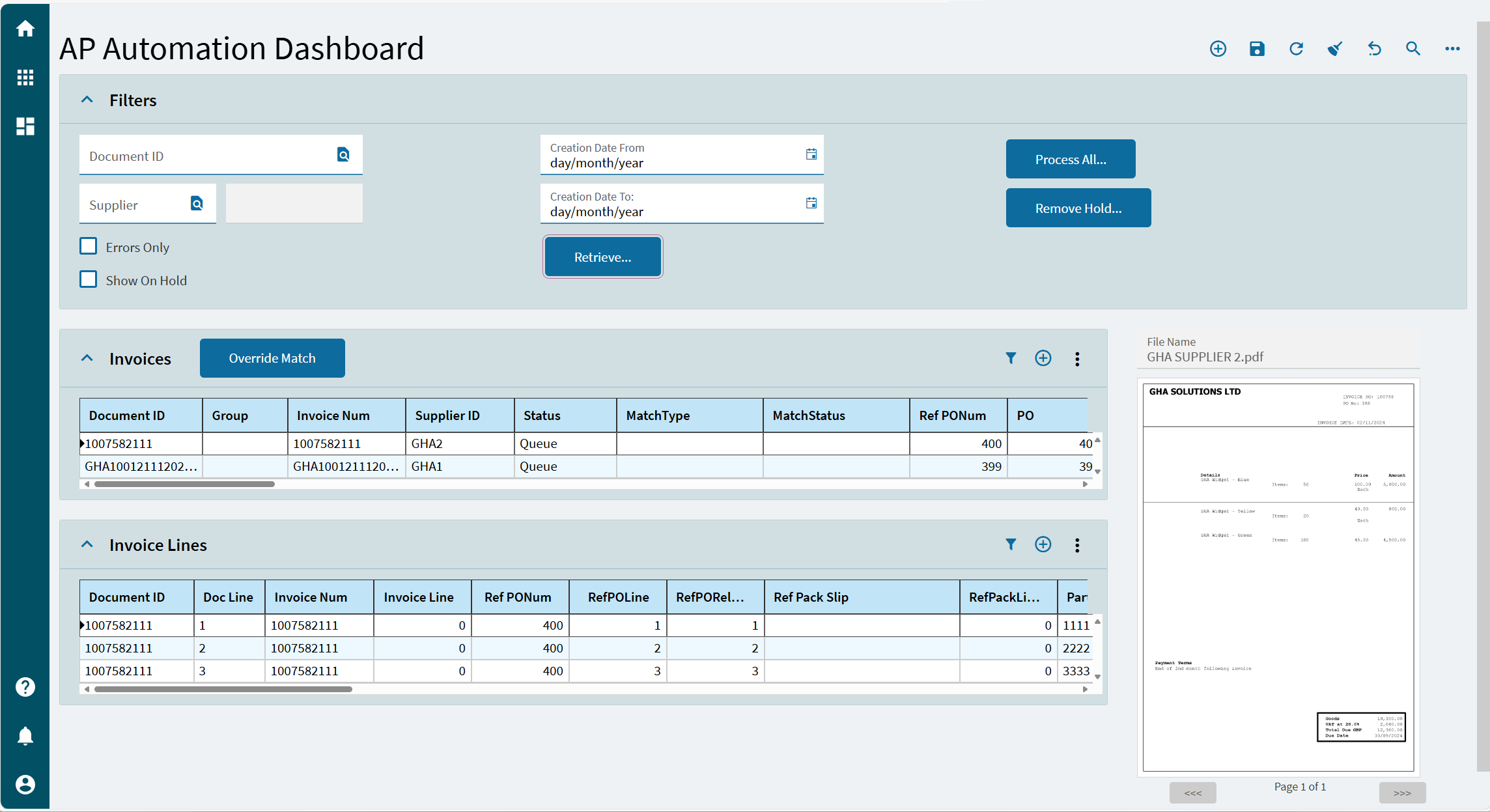 - Automated attachment of invoice against all documents processed