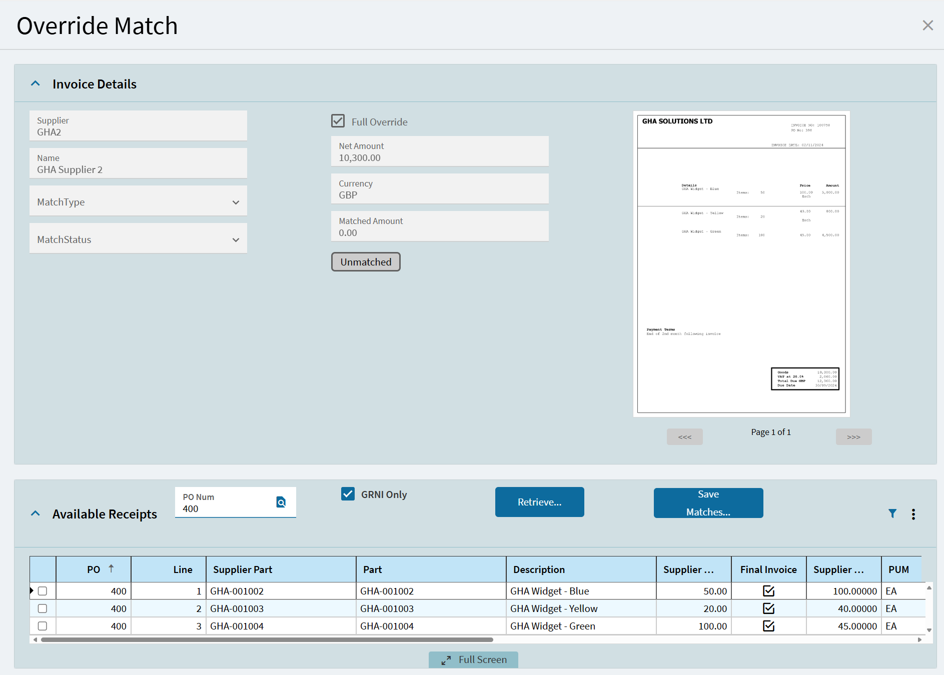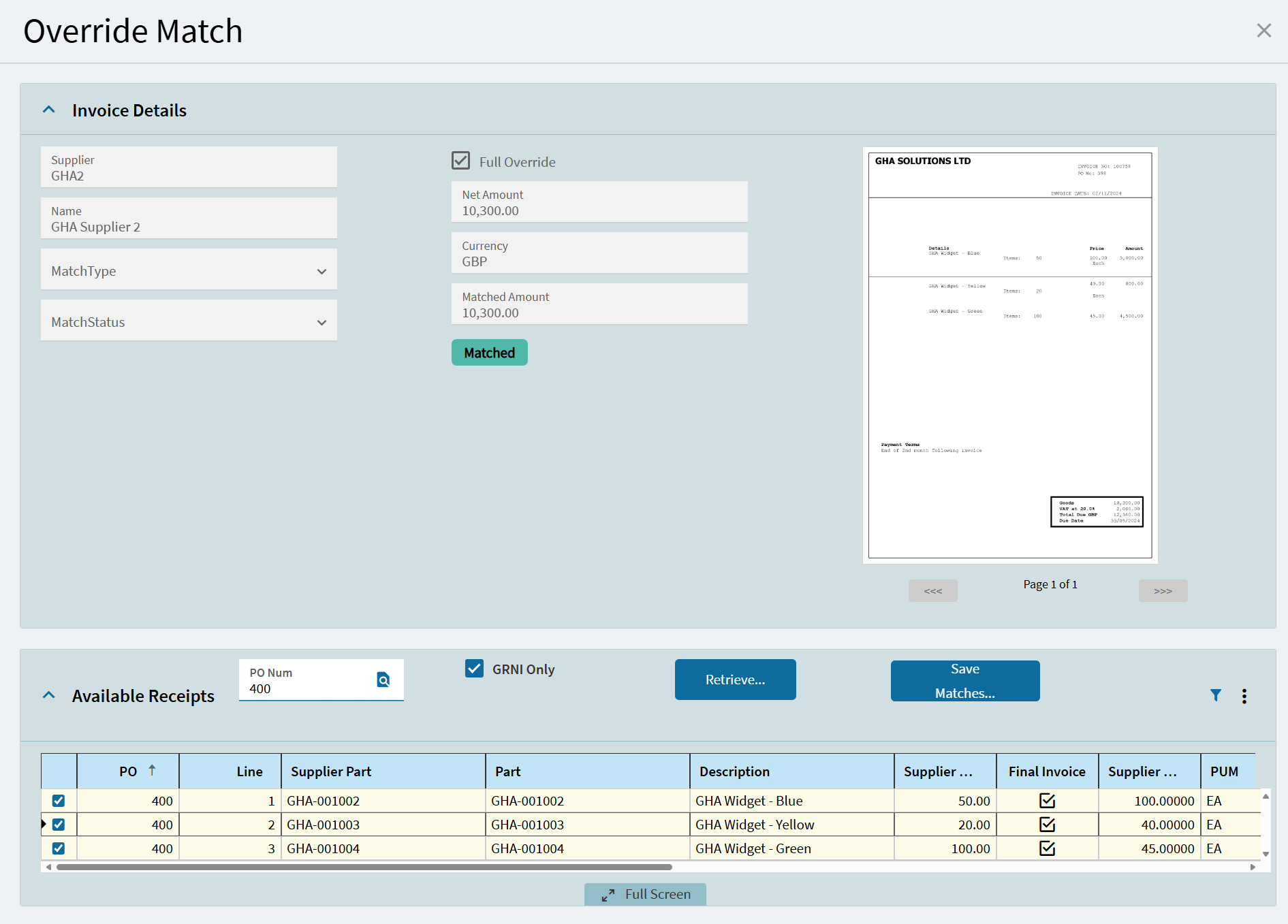 Perfect match automation creates invoices where supplier, PO number, part and qty match.