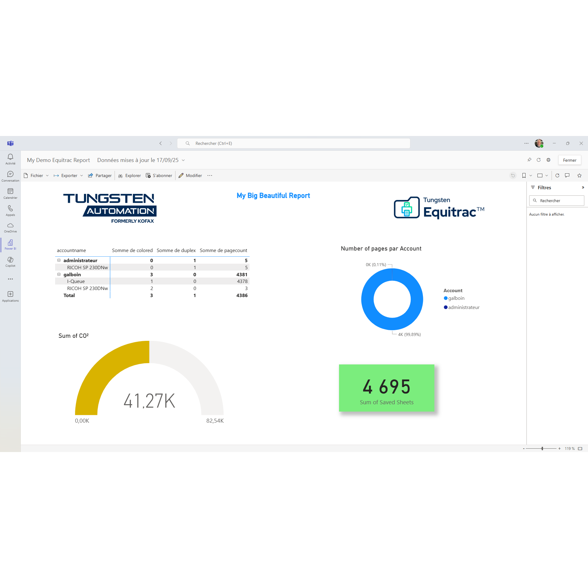 You'll find attached a PDF explaining step by step how to do Equitrac (ControlSuite) reports with Microsoft Power BI. As well a sample Power BI report and a sql script to create a VIEW for the savings (eco indicators) in the Equitrac database.