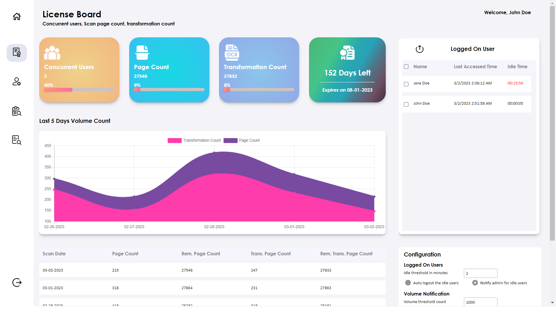 - Monitors the expiration and consumption of licenses related to concurrent users, scanned pages, and transformed pages.