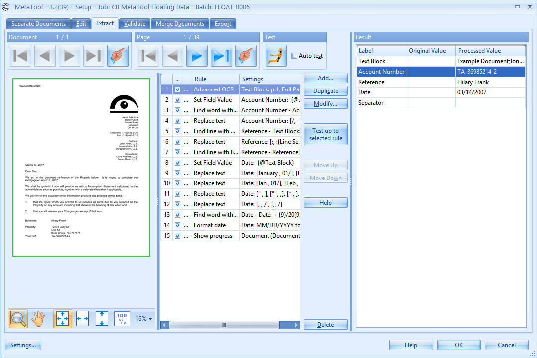 Instead of one complex setup screen with hundreds of options, CaptureBites™ MetaTool is based on a range of easy to understand rules such as “Extract Zone with OCR”, “Find line containing Words”, “Replace Text”, “Format Date”, etc.