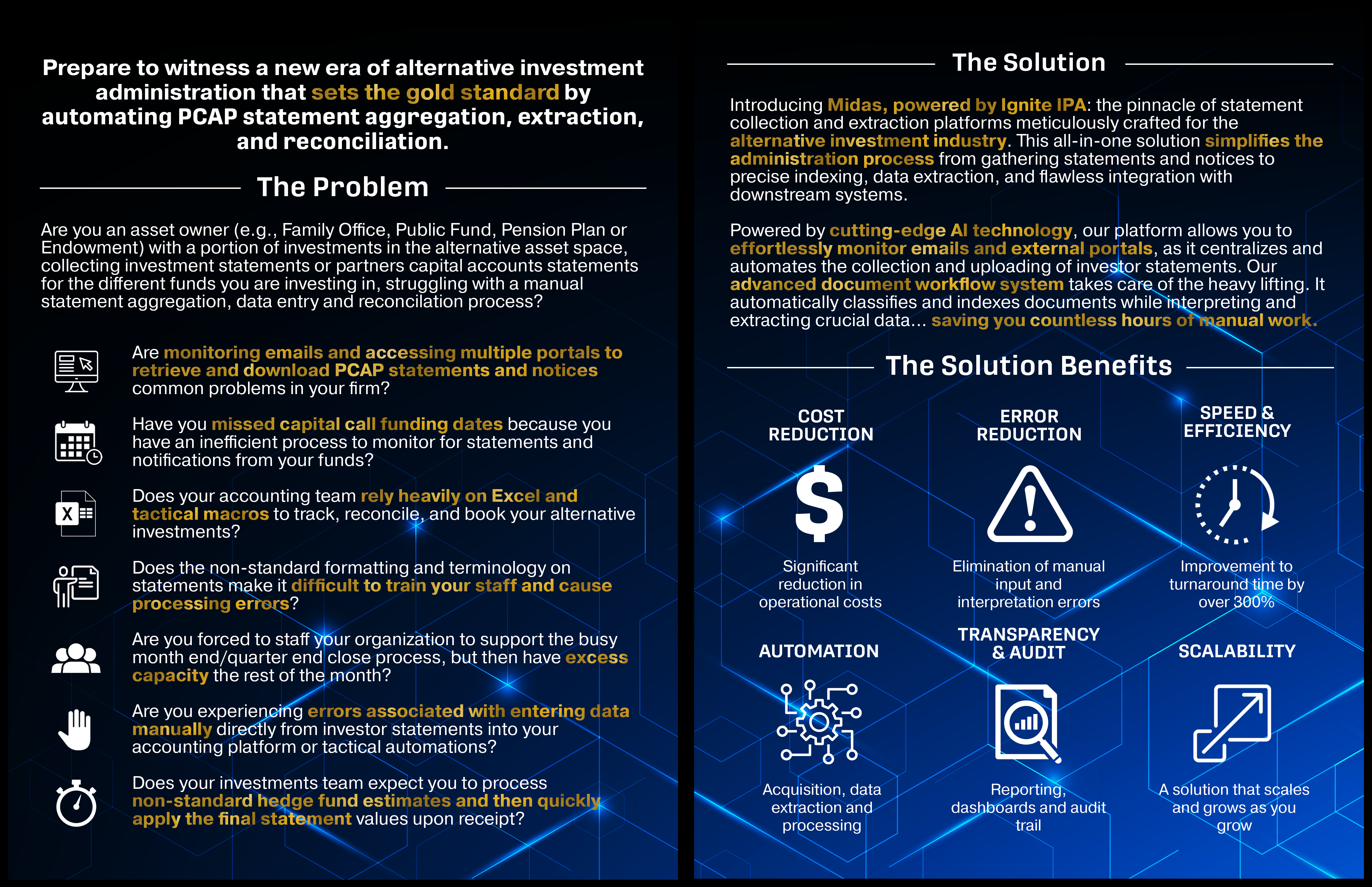 Midas, powered by Ignite IPA, is a premier platform for the alternative investment industry, streamlining statement collection and data extraction with precision and flawless system integration. It utilizes advanced AI to automate email and portal monitoring, centralizing investor statement collection and uploading. The system auto-classifies, indexes, and interprets crucial data, reducing manual work and ensuring accurate, efficient document management in one comprehensive solution.