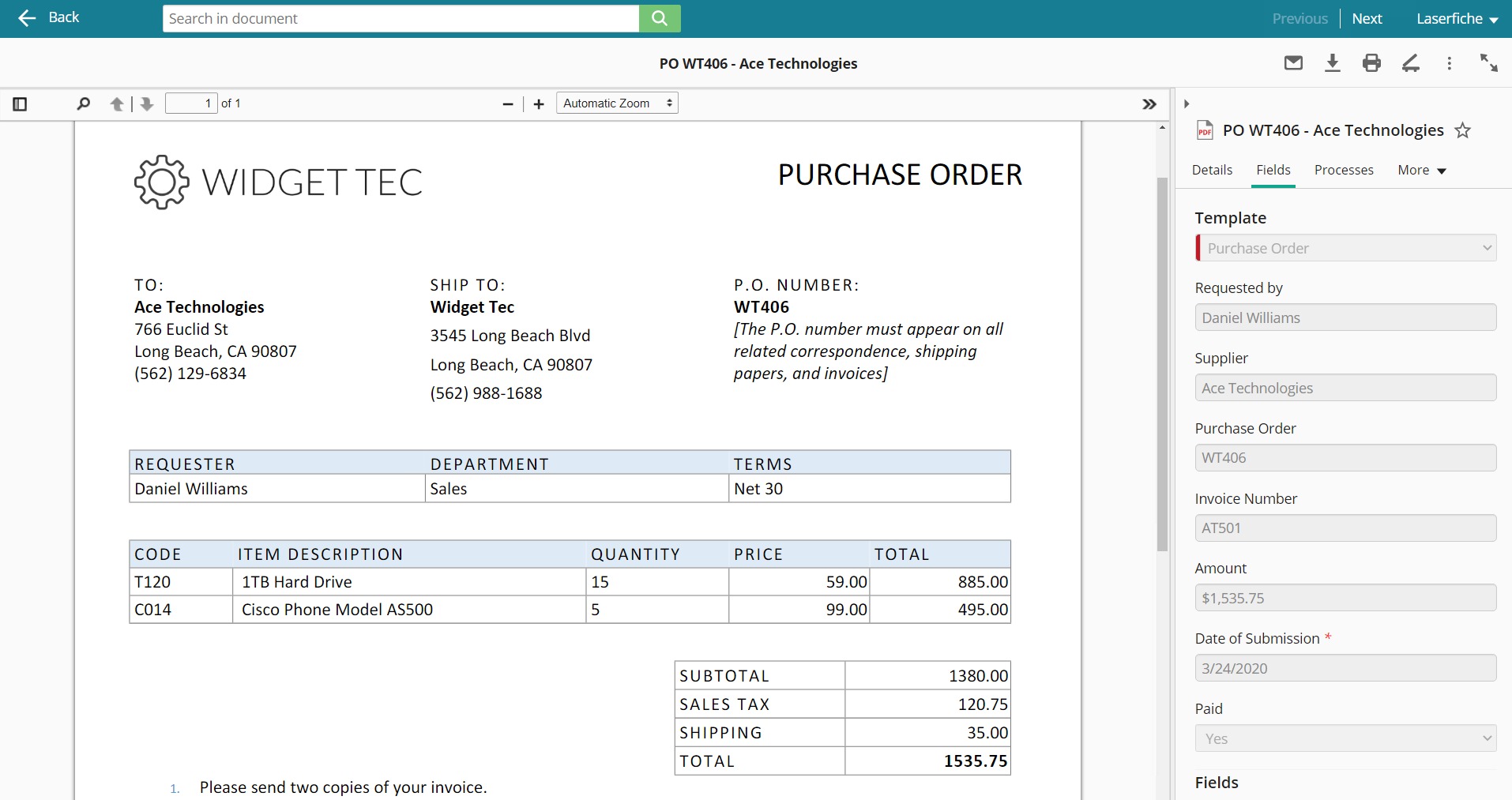 In Laserfiche, metadata refers to information about a document that is stored alongside the document. The most common form of metadata is fields. Fields can store many different types of information, like names, dates, ID numbers, and addresses.
