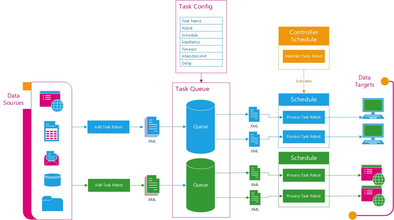 - Each queue has its own configuration that specifies a schedule responsible for starting one or more process task robots.