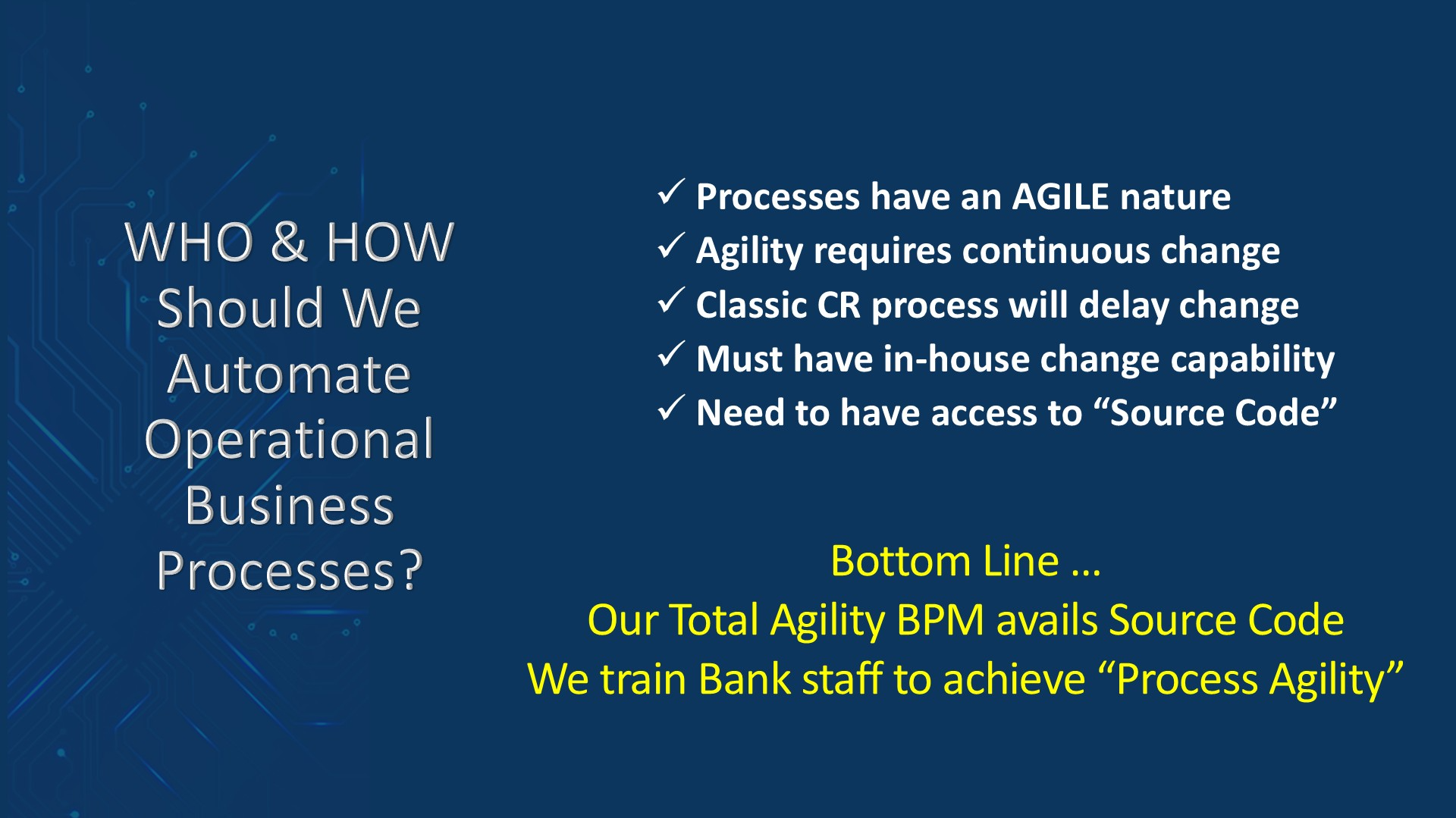 Our Total Agility BPM avails Source Code. We train Bank staff to achieve “Process Agility”